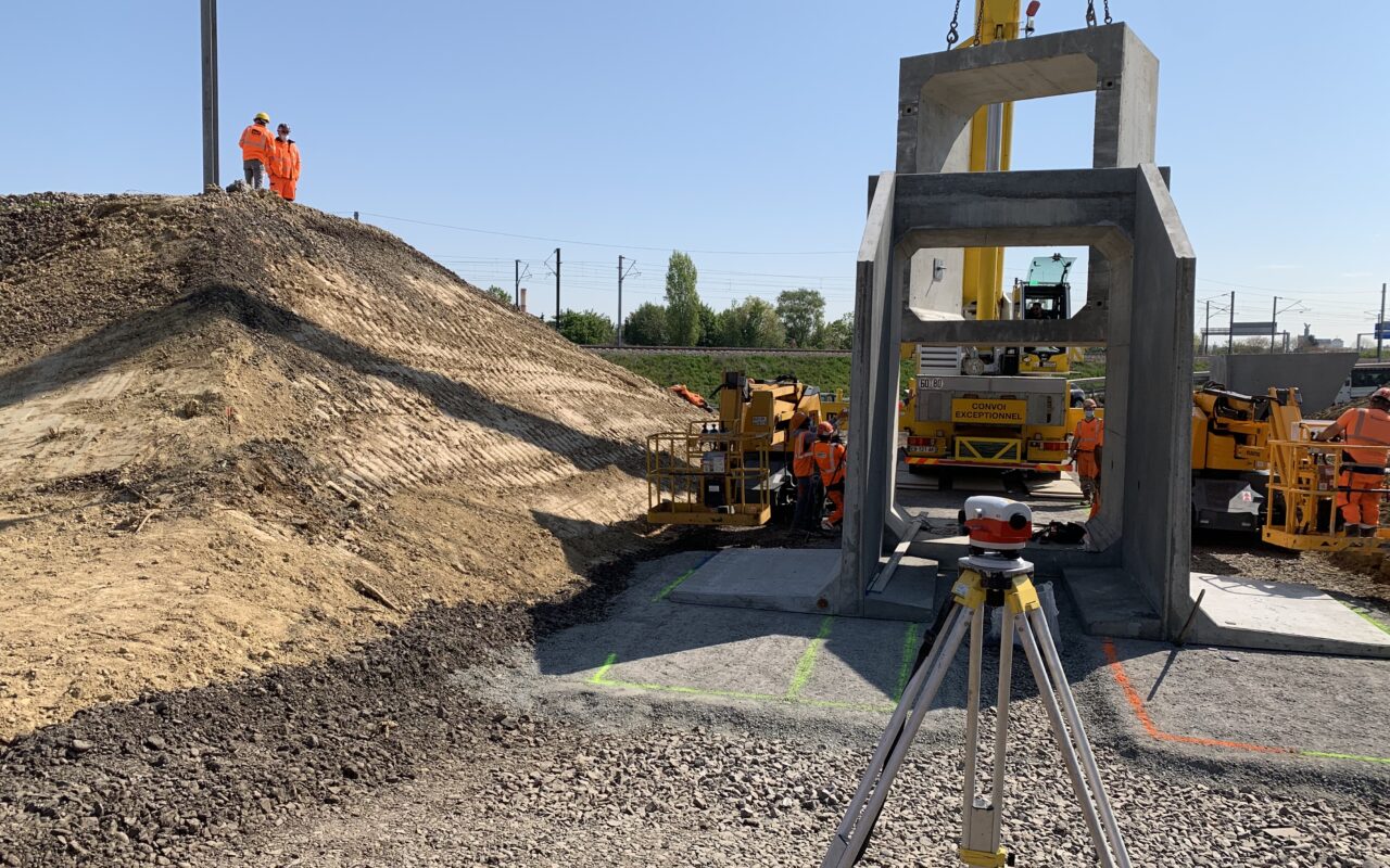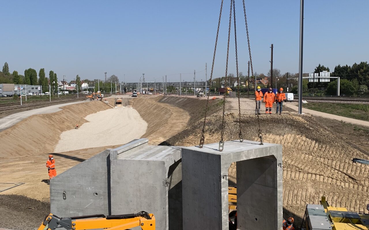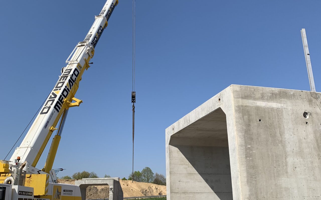 Sur un site SNCF, création d’un passage sous voie dans la proche périphérie de Strasbourg avec un ouvrage composé de cadres et de murs rampants sur mesure.
