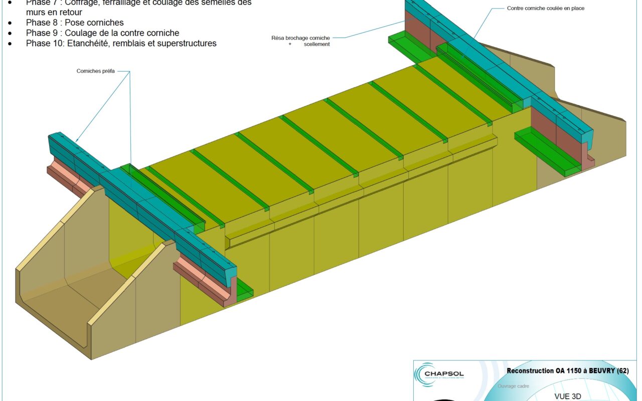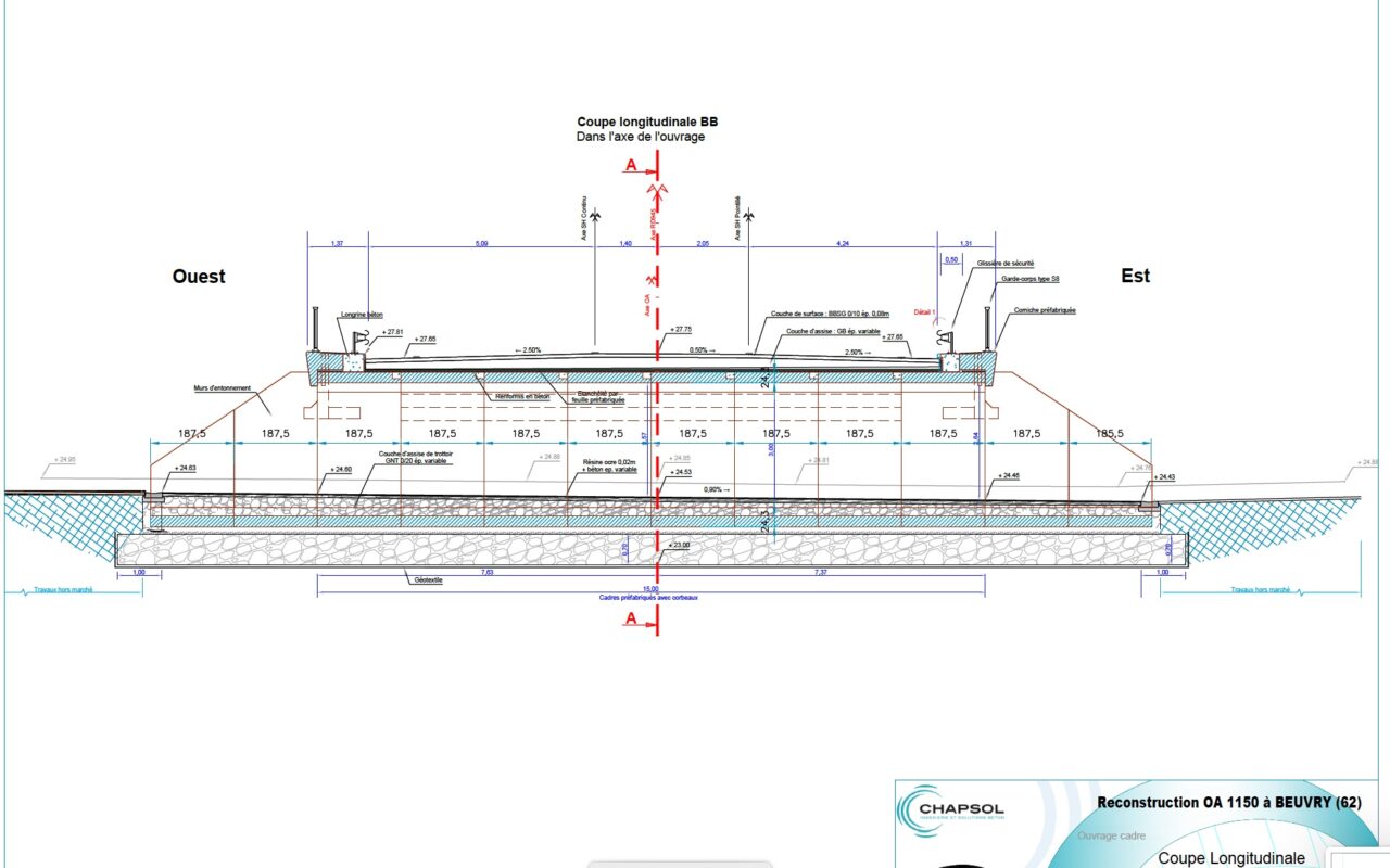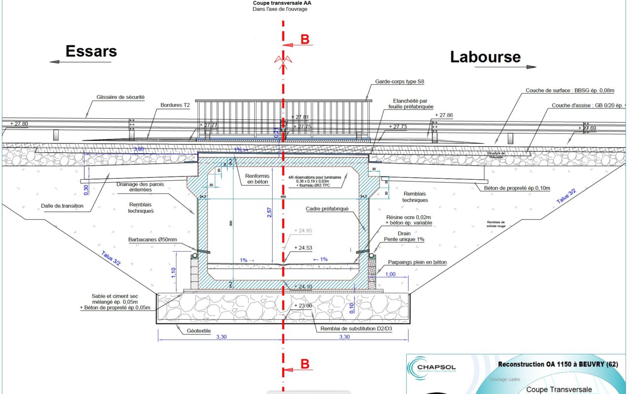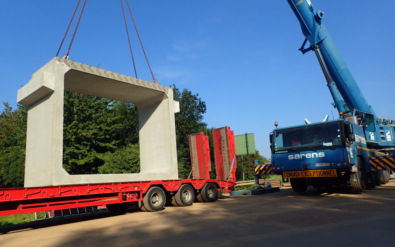 Dans le cadre de la reconstruction et l’agrandissement de l’ouvrage n°1150 à BEUVRY (62) sous la RD 945 (Rocade Ouest) nous avons conçu pour l’entreprise ETGC un passage piéton mixant nos gammes pour un résultat 100% préfa.