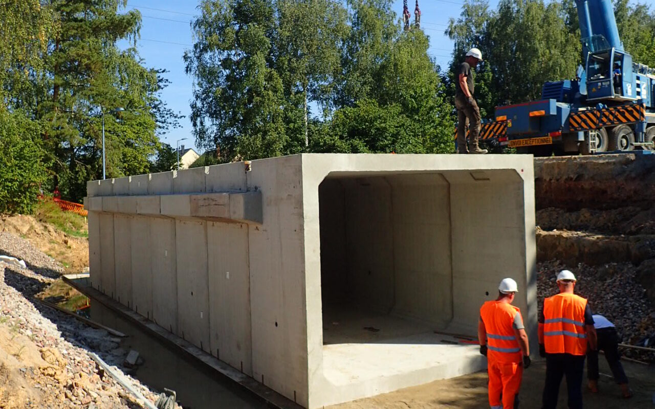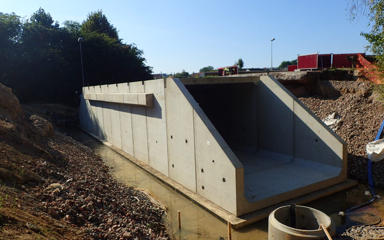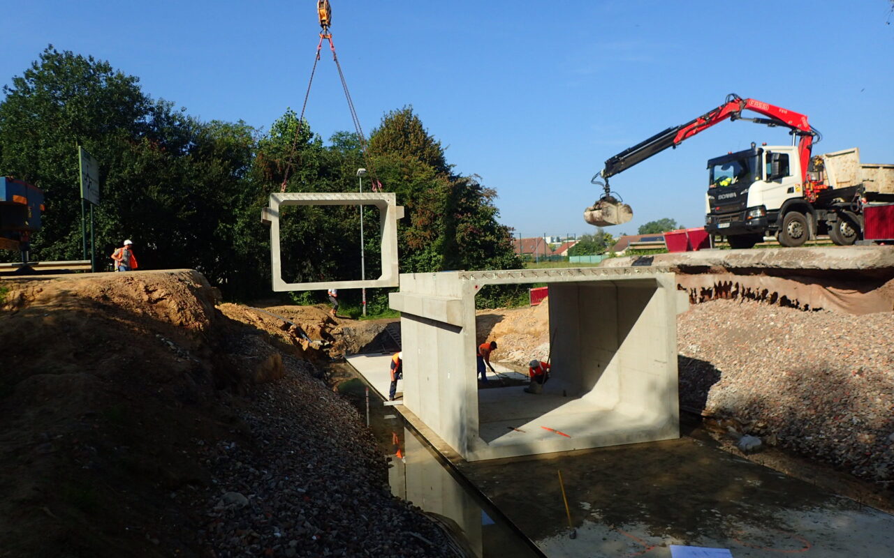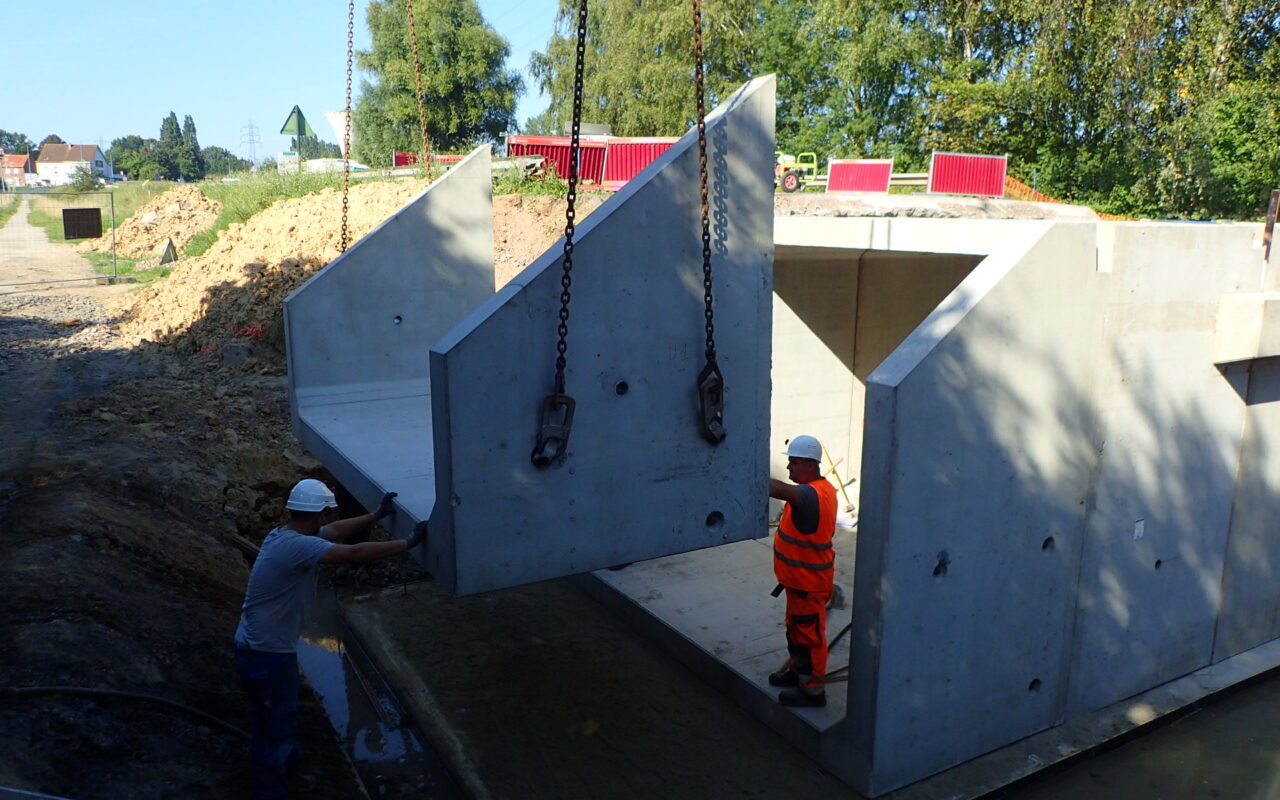 Dans le cadre de la reconstruction et l’agrandissement de l’ouvrage n°1150 à BEUVRY (62) sous la RD 945 (Rocade Ouest) nous avons conçu pour l’entreprise ETGC un passage piéton mixant nos gammes pour un résultat 100% préfa.